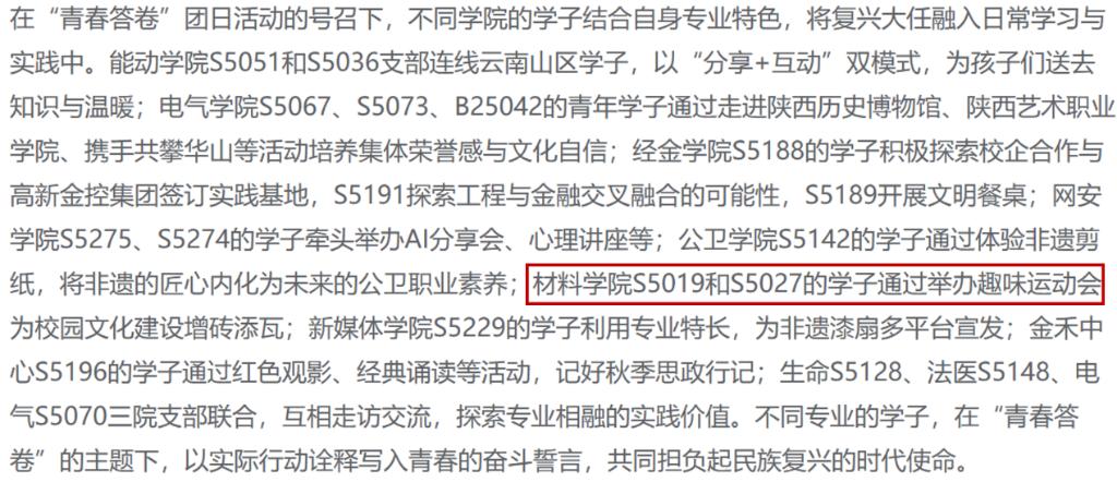 S5019 党支部与团支部积极与各学院支部交流党建工作经验,联合多个当团支部参与实践活动,与S5027党支部共同组织“趣味运动会”。全体党员与团员在合作中收获友谊,在竞争中锻炼体魄,相关事迹被新华网、人民日报报道。
