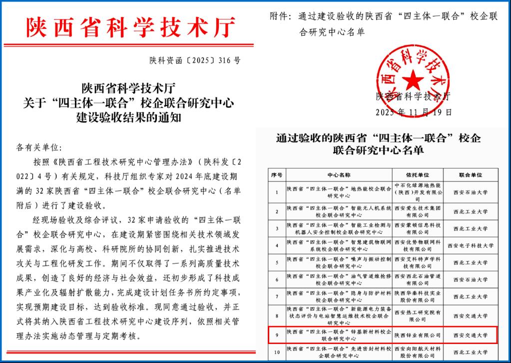 与陕西锌业有限公司联合组建的陕西省“四主体一联合”锌基新材料校企联合研究中心顺利通过验收(验收批复文件:陕科资函〔2025〕316号),正式纳入陕西省工程技术研究中心建设序列。这标志着双方在锌基新材料领域的产学研协同创新与深度融合发展取得了重要突破。
