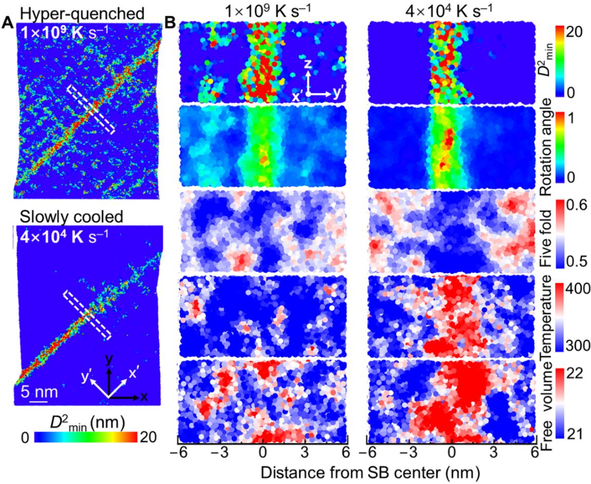图1. 超快淬火和缓慢冷却的Mg65Cu25Y10 非晶样品中剪切带的微观性质。