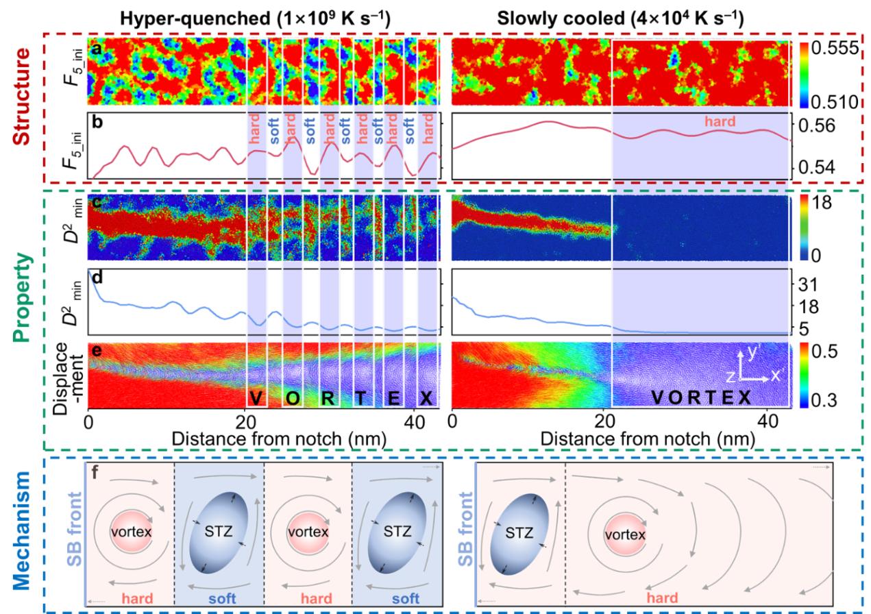 金属材料强度全国重点实验室材料创新设计中心(CAID)丁俊教授和马恩教授带领的研究团队,基于其先前开发的高效分子动力学-蒙特卡罗耦合模拟方法(研究团队的近期论文PNAS, 119 (2022) e2213941119计算模拟出接近真实实验冷速的CuZr金属玻璃),成功地研究了Mg₆₅Cu₂₅Y₁₀非晶合金在冷却速率跨越9个数量级(从与实验铸造条件相当的104 K/s到常见分子动力学模拟速率1013 K/s)下的结构演化与剪切带变形行为。研究结果表明,与超快速冷却样品相比,缓慢冷却样品中剪切带的各种性质均变化(升高/降低)明显(图1)。进一步分析发现,结构状态的演变导致剪切带延展机制发生了定性转变。在超快速冷却的样品中,剪切带扩展呈现间歇性特征,表现为多个剪切变形区的顺序激活和合并,而这些剪切变形区之间由涡漩场隔开。相比之下,缓慢冷却的样品表现出连续且快速的剪切带传播,由局部剪切软化和大型涡漩场的形成介导,其结构响应具有更强的集体性。这种机制的转变来源于不同结构状态下激活剪切变形区的数密度和空间分布的显著差异(图2)。