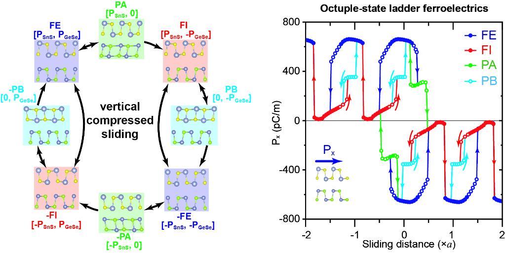 强度室的邓俊楷教授同澳大利亚墨尔本大学刘哲教授合作,在双层GeSe/SnS范德华异质结中,发现了由面外压缩和层间滑移协同诱发的多级铁电相变和八种极化态阶梯铁电现象。研究团队利用极化大小不同的GeSe和SnS两种IV-VI族二维铁电材料,构筑了双层范德华异质结,并形成了稳定铁电相和亚铁电相。研究发现,通过面外压缩应变条件下的层间滑移,层间范德华相互作用能和层内变形弹性能之间相互竞争,促使类黑磷烯褶皱结构的GeSe和SnS分别向一种新的倾斜型顺电结构转变,从而诱发了两种具有不同极化状态的中间相。铁电相和亚铁电相可以通过这两个新相为媒介互相转换,实现铁电-亚铁电相变。最终,铁电相、亚铁电相和两个新相之间可以通过层间滑移引起的多级相变相互转变,形成一个闭合的循环路径,产生共八种不同的极化状态,极化的大小呈阶梯状递增,因而称为“阶梯铁电”现象。八种极化态现象是双层二维材料中目前已知的最多极化状态,为设计新型多态铁电材料提供了一种新的思路,有望应用于未来的铁电信息存储技术。