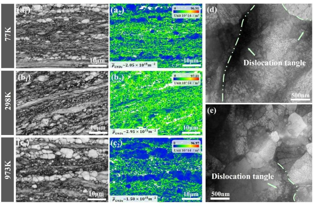 金属材料强度全国重点实验室材料创新与设计中心(CAID)丁俊教授、马恩教授团队设计出一种可冷加工的Nb–Ta–Ti–Hf基难熔高熵合金(成分:Nb₄₃.₂Ta₂₇Ti₁₃Hf₁₅Re₁.₅B₀.₃)。研究人员采用冷轧+退火的热机械处理工艺,成功构筑出一种热稳定的异质晶粒结构,由纳米级超细晶、细晶和残余变形晶协同组成,形成力学性能梯度(图1)。实验结果显示,该合金在77 K低温下抗拉强度超过1.8 GPa,延展率保持在约10%;在973 K高温下仍能维持超过900 MPa的抗拉强度,刷新了单相固溶体类合金的纪录。进一步的原位力学和显微分析揭示,这种优异性能源于HDI强化机制:在软硬区域的变形过程中发生应变分配与位错累积,在界面处形成反向与正向内应力,显著提升了加工硬化能力(图2)。值得强调的是,该机制不仅在室温和低温下有效,而且在高温条件下依然能够持续发挥作用。