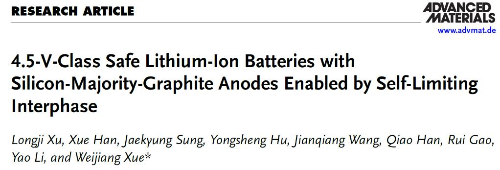 以上工作成果以《自限性界面赋能4.5 V级高硅负极高安全锂离子电池》(“4.5-V-class safe lithium-ion batteries with silicon-majority-graphite anodes enabled by self-limiting interphase”)为题,发表于国际权威杂志《先进材料》(Advanced Materials)。香蕉视频
