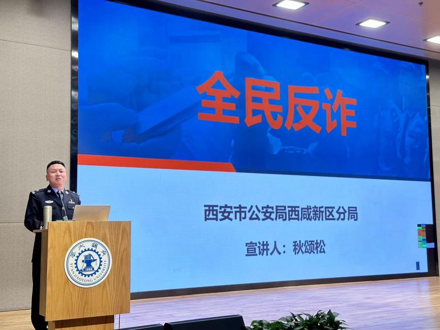 讲座首先由西安市公安局西咸新区分局刑事侦查大队一中队合成作战反诈中心秋颂松警官进行反诈教育。秋警官首先向同学们介绍了什么是电信诈骗,之后通过一个个真实案例让同学们充分认识到电信诈骗的常见骗术以及如何识别防范电信诈骗。他提醒同学们,生活中要注意避免个人资料外泄,对陌生电话保持警惕,如果遇到不能准确确认身份的陌生号码通过电话、短信、网络等方法要求转账、汇款,务必不要转钱,并及时报警。